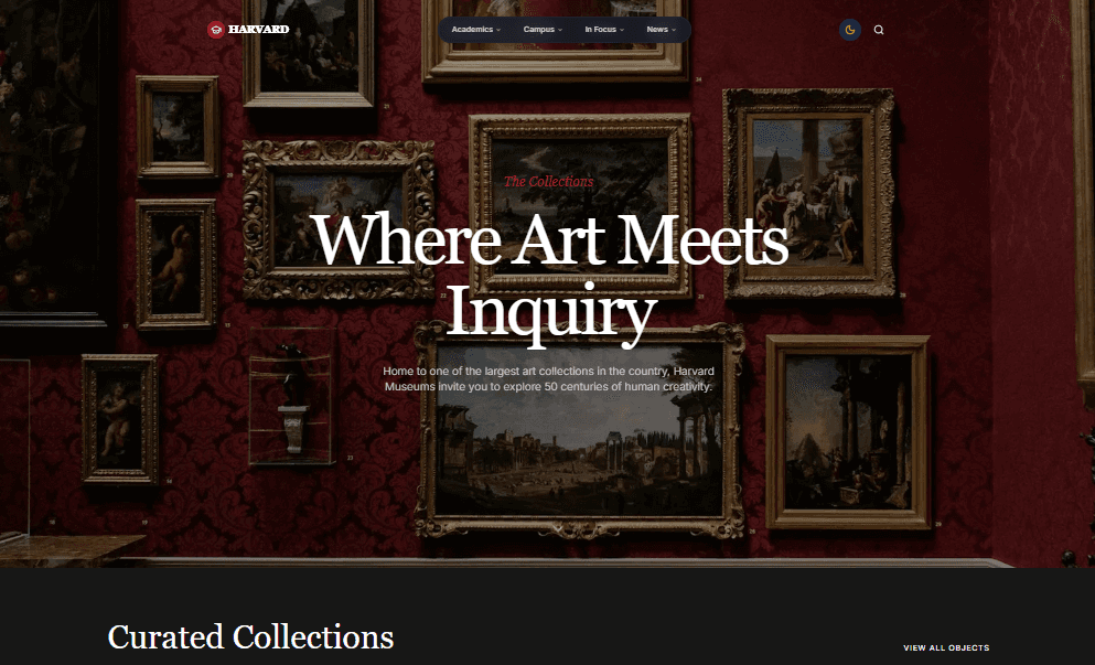 A visually immersive page designed to present Harvard’s prestigious museums in a compelling way, inviting visitors to explore the university’s rich cultural and historical legacy.