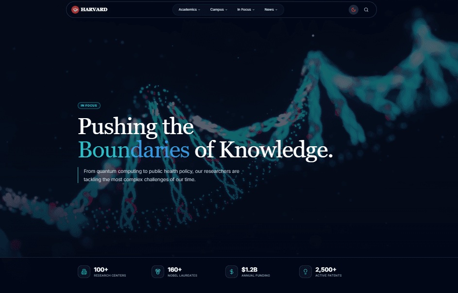 A dedicated page highlighting Harvard University’s leadership in biotechnology and genetic research, showcasing groundbreaking innovation and academic excellence through a clear, modern, and informative interface.