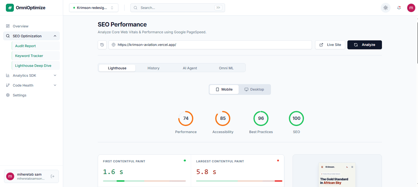 The SEO optimization page lets you simply paste your deployed website URL ... nothing more is required. Instantly, you’ll see detailed performance insights for both desktop and mobile, helping you understand how your site performs across devices.