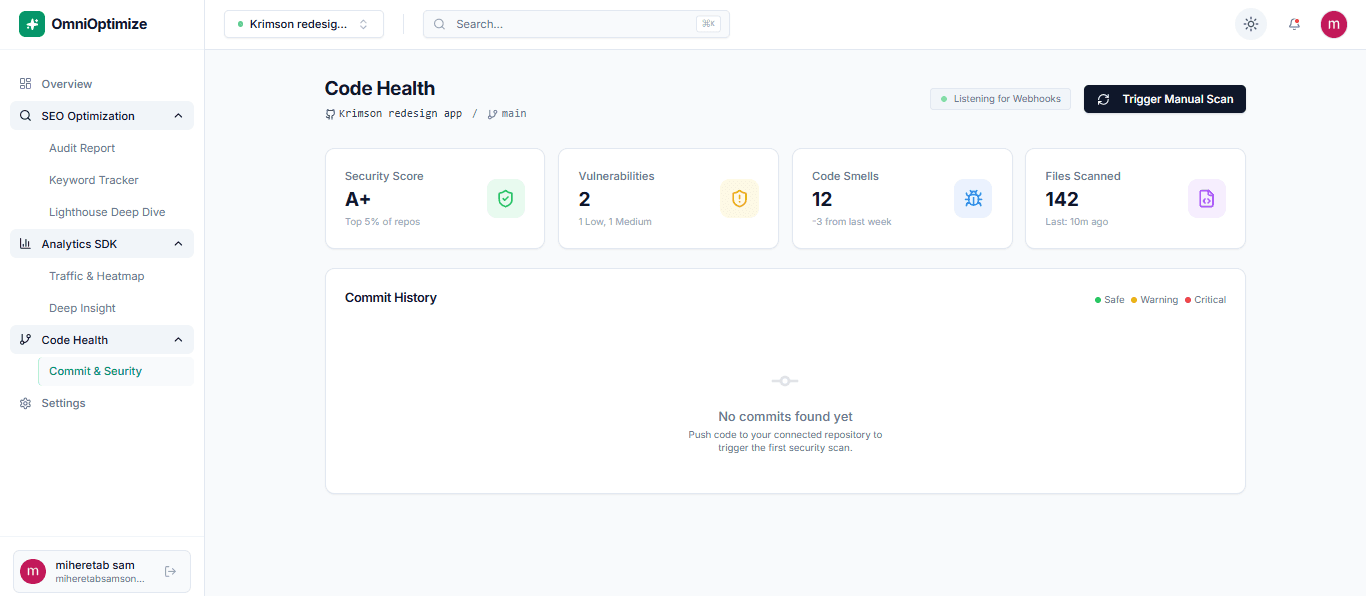 The Code Health section only requires you to connect our webhook URL to the project you’ve created. Once set up, you’re ready to go ... just keep pushing code, and Omni Optimize will continuously monitor, analyze, and guide you throughout your entire development process.